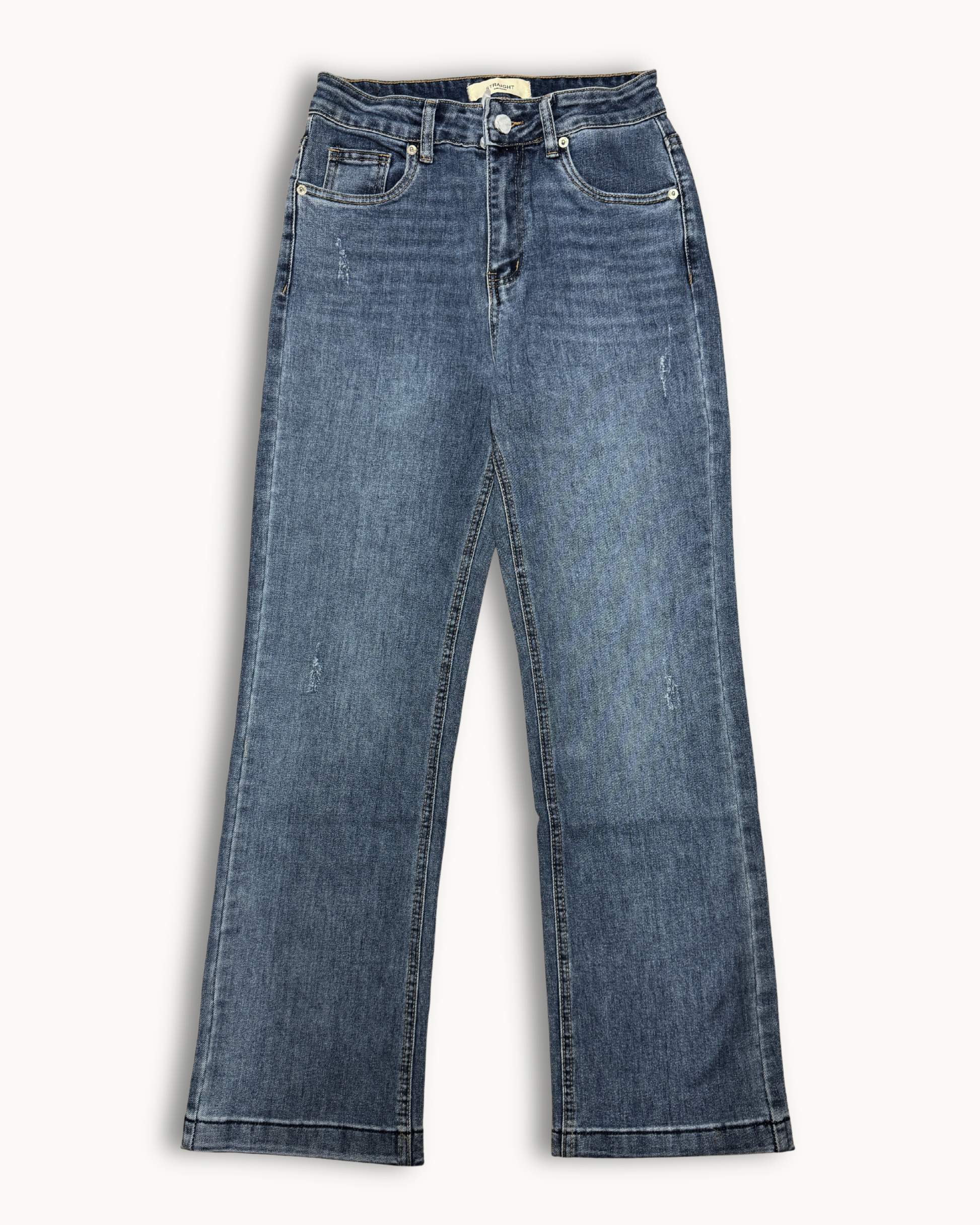• Verarbeitung: Hoher Bund, gerades Bein, Mid-Blue Denim.