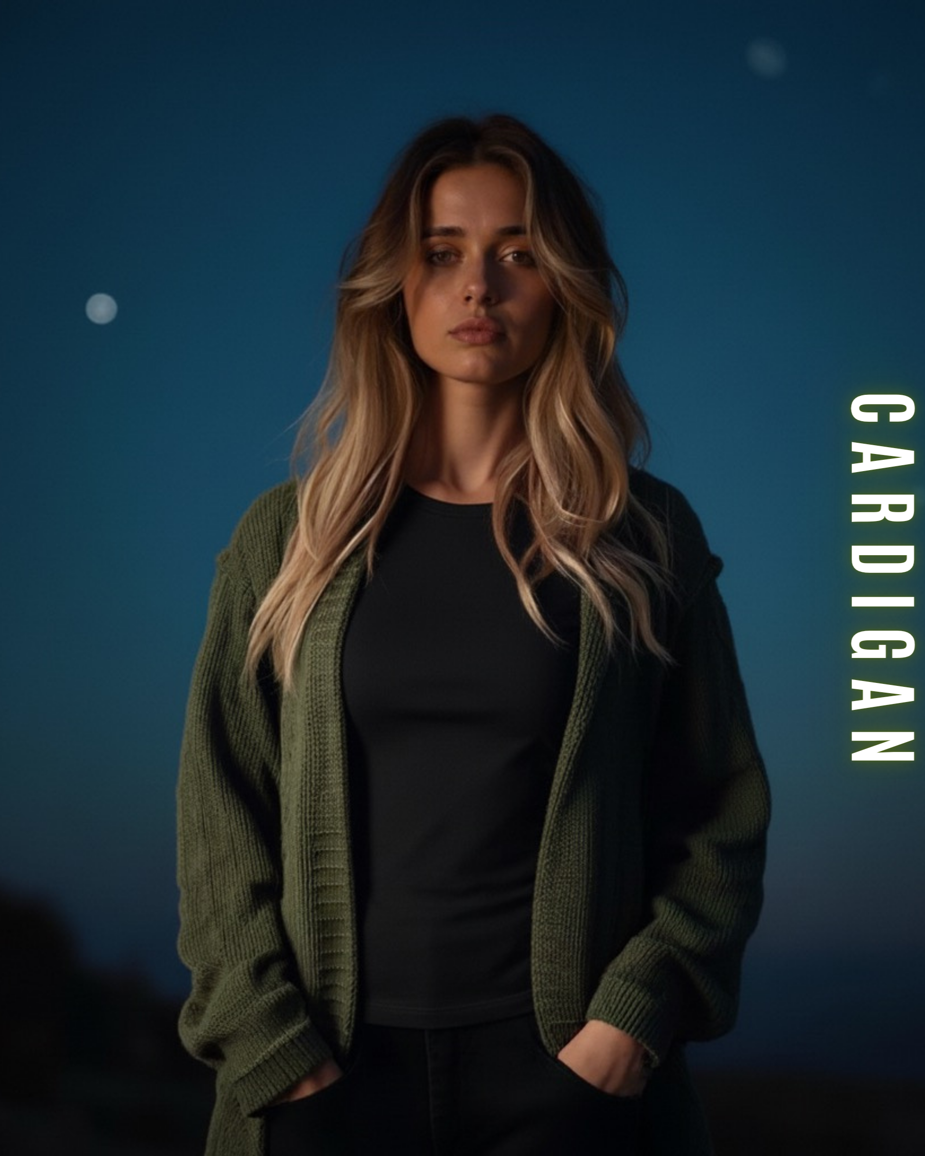 • Verarbeitung: Offen, mit Kapuze und klassischem Strickmuster.