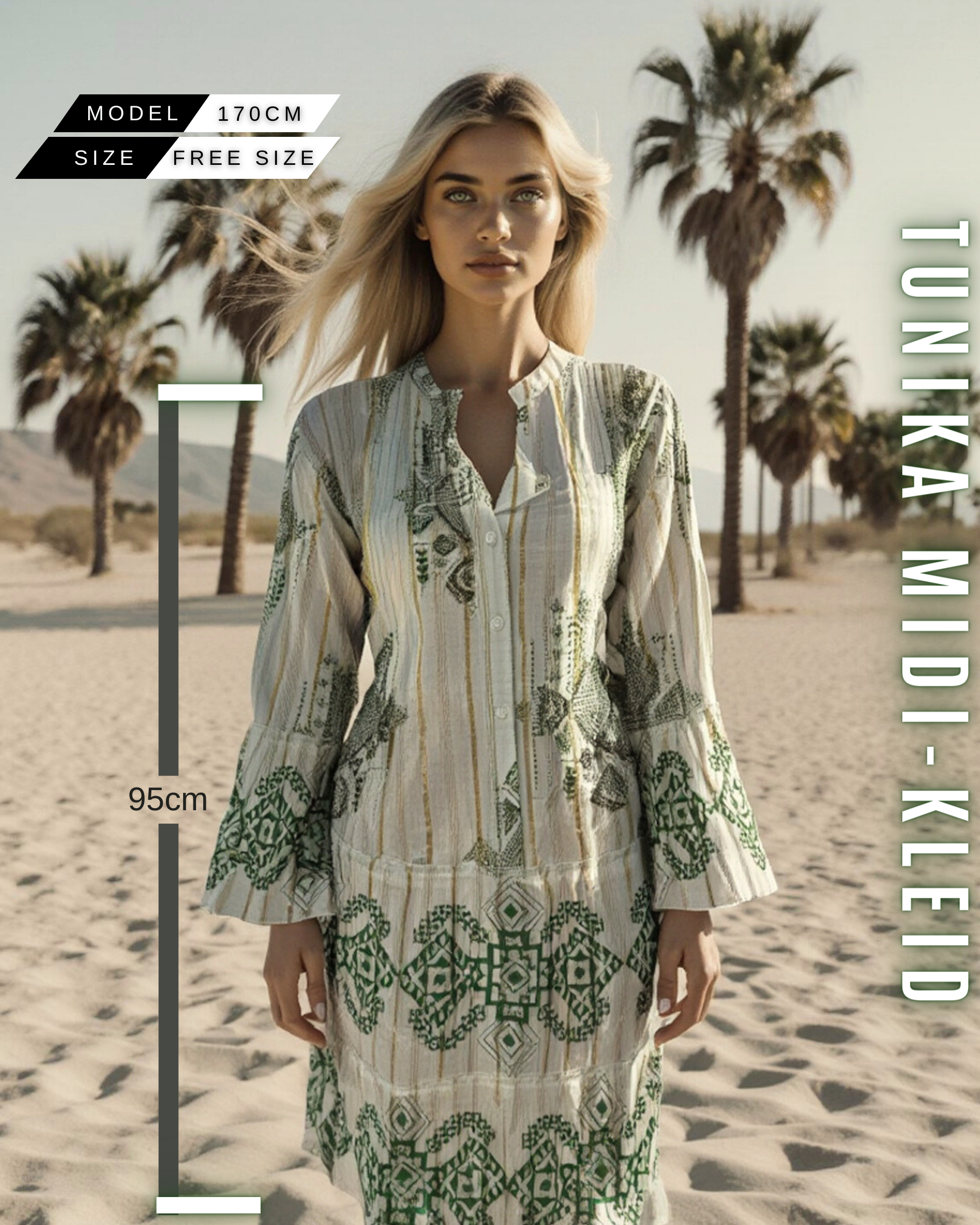 • Luftiges Tunika-Midikleid in A-Linie mit V-Ausschnitt, langen Ärmeln und Stickereien.